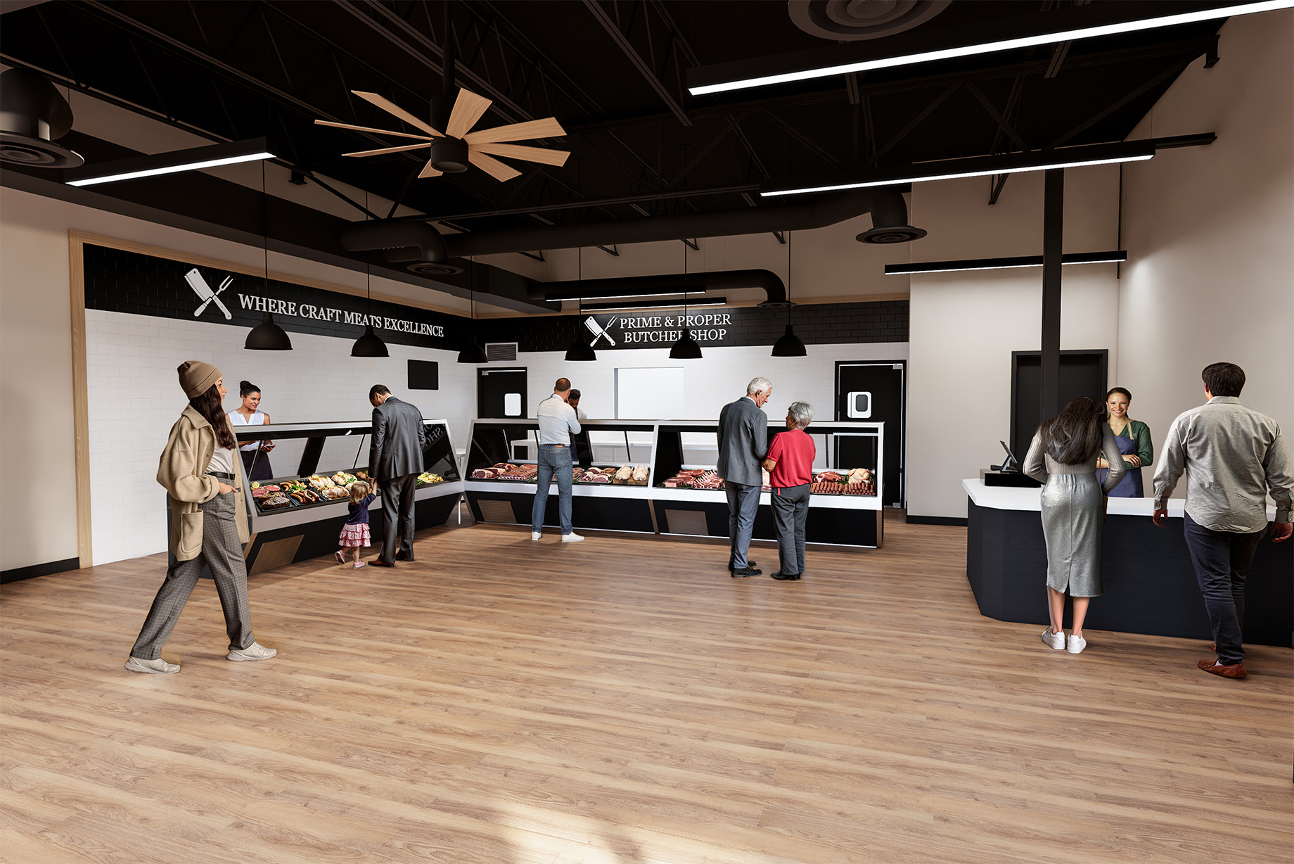 GEM Studio was hired by Prime and Proper to design a new butcher shop in a vacant space of an existing retail shopping center in Littleton. The new shop includes a retail sales area, prep kitchen, walk-in cooler, walk-in freezer, office, breakroom, and support spaces. Finishes in the sales area include wall tile, LVT flooring, exposed painted structure & ductwork, pendant lighting, display shelving, meat cases, a custom check out counter, and reach-in refrigerators & freezers. A view window was designed between the prep kitchen and the sales area to create connection between the back and front of house.